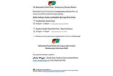 Ballasalla Youth Club – Temporary Closure Ballasalla Youth Club is temporarily closed while we complete staff recruitment and training. Alternative Wednesday Clubs Children are welcome to attend either of the following: Castletown Youth Club – 4:30pm–6:00pm Rushen Youth Club (Port Erin) – 4:30pm–6:…
